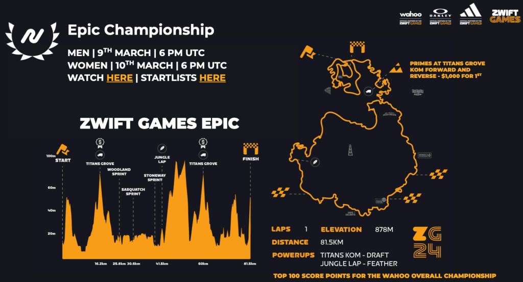 This challenging standalone race on the newly crafted Zwift Games 2024 Epic route designed to push the limits of endurance promises to be unforgettable. With a $1,000 prime at the Titans KOM forward and reverse, an intriguing strategic twist is added to the mix.