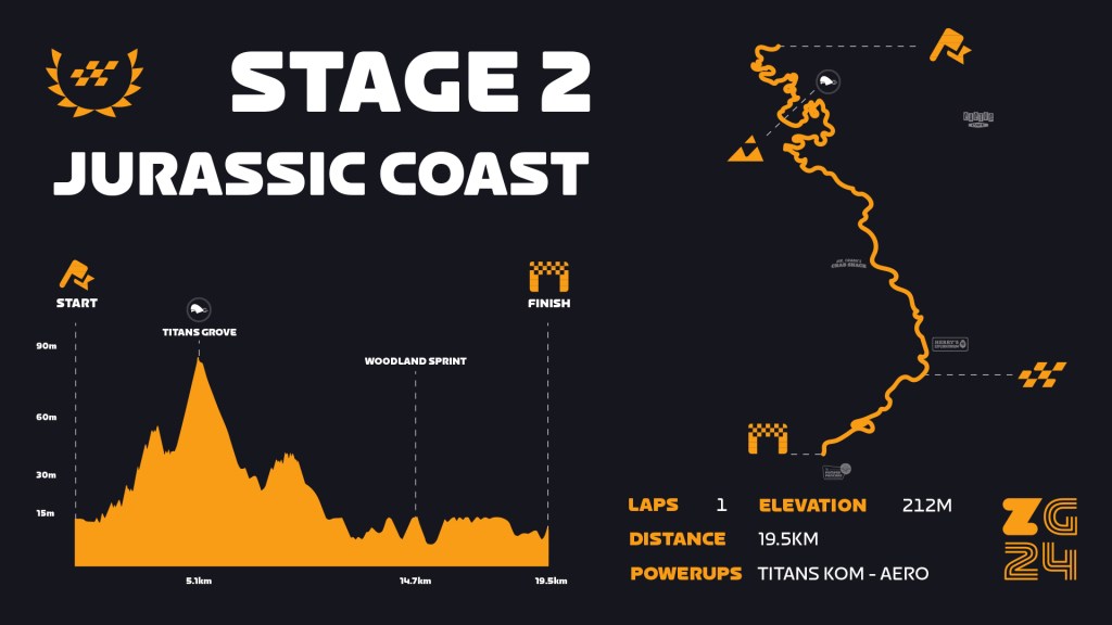 The newly designed Jurassic Coast route is the stage of the scene of the second Sprint Stage. The race totals 19.5 km with 212 m of ascent, starting in the Fuego Flats start pens and climbing through Titans Grove to Watopia’s Southern Coast.