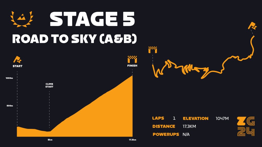 Category A&B riders will race to the top of the iconic Alpe du Zwift during Stage 5, covering 17.3 km with 1,047 m of climbing.