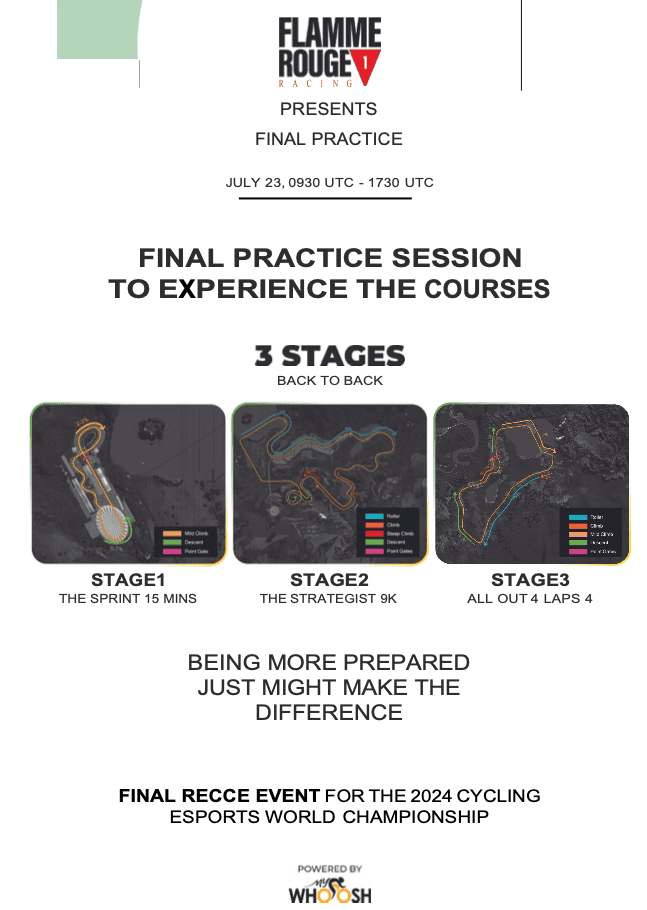 Flamme Rouge Racing and MyWhoosh have joined up to present a Final Practice Session on July 23rd to recon the courses and test the tweaks! All of the information is listed at the end of this article. Don’t miss your last chance to experience the routes and format!