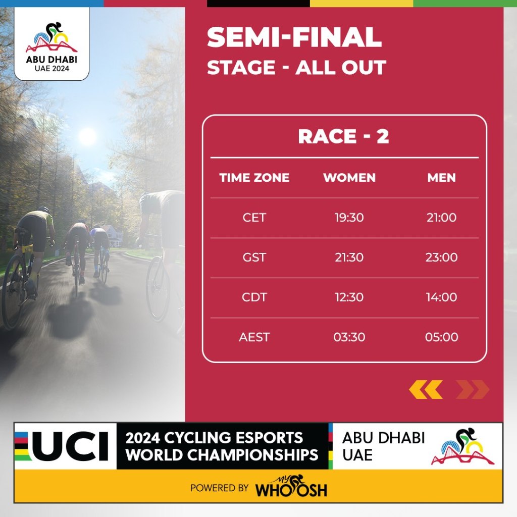 UCI and MyWhoosh have released the schedule, format, courses, and viewing information for the September 6, 2024 semi-final. Here's all you need to know!