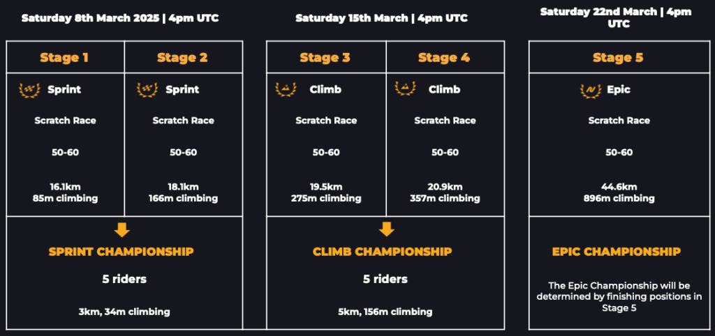 The Sprint Stages and Championship will be at 4 pm UTC on Saturday, March 8th, 2025. The Climb will follow at the same time the next week, Saturday, March 15th, 2025. Then, the Epic a week later on Saturday, March 22nd, 2025.