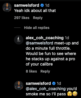 When Mackie’s coach, Alex Coh, threw down the gauntlet, the powerhouse Aussie sprinter kept it classy, sidestepping the drama with: “you’d smoke me so I’ll pass 🫣🤣.“